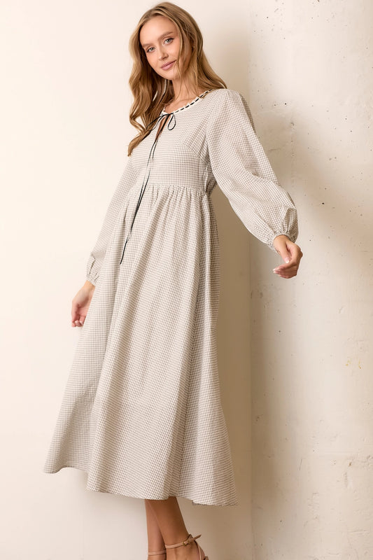 AusverkauftKariertes Langarm Kleid "Lina" Creme